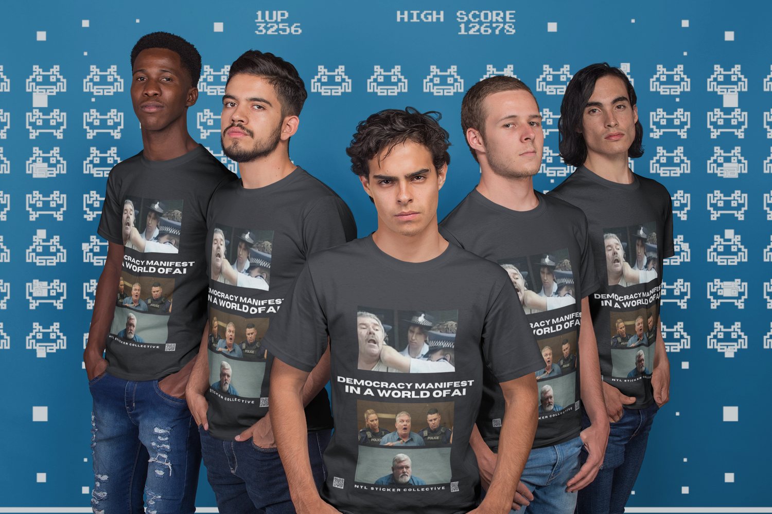 - Style: The judo hold image from the arrest of the Democracy Manifest Guy